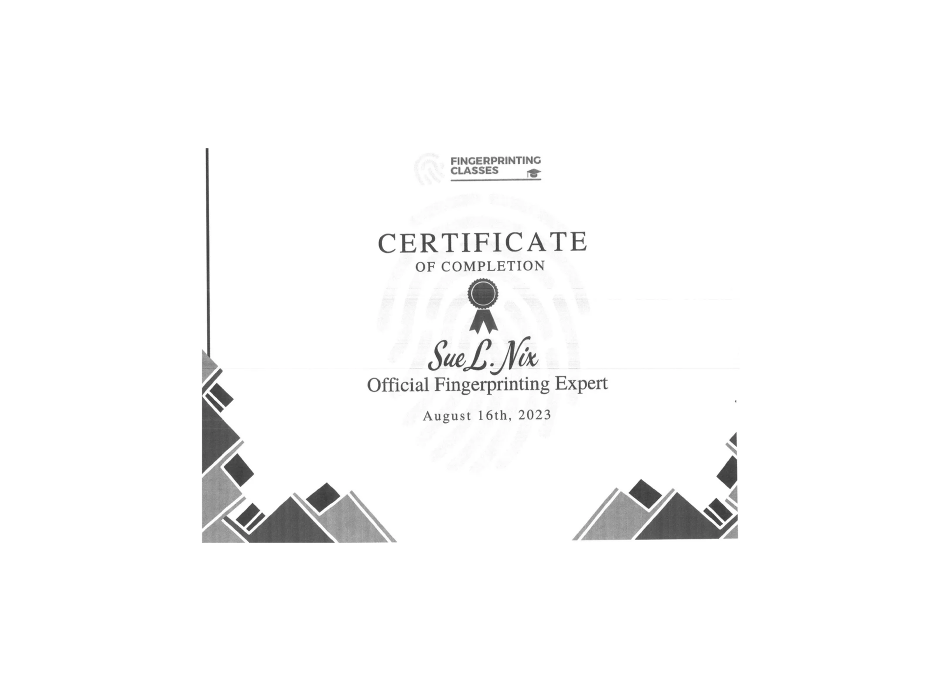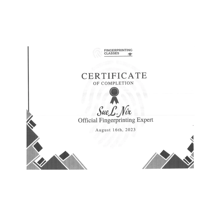 We have received Certificate of Completion in Fingerprinting Course, which signifies that we have successfully completed the necessary training and have acquired the essential skills required in the fingerprinting process. This certification enhances our qualifications and demonstrates our commitment to maintaining high standards in the field. We look forward to utilizing this knowledge in our future endeavors.